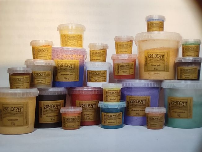 ganze Palette an Pigmenten von Kreidezeit für die Wandfarben und Öle.