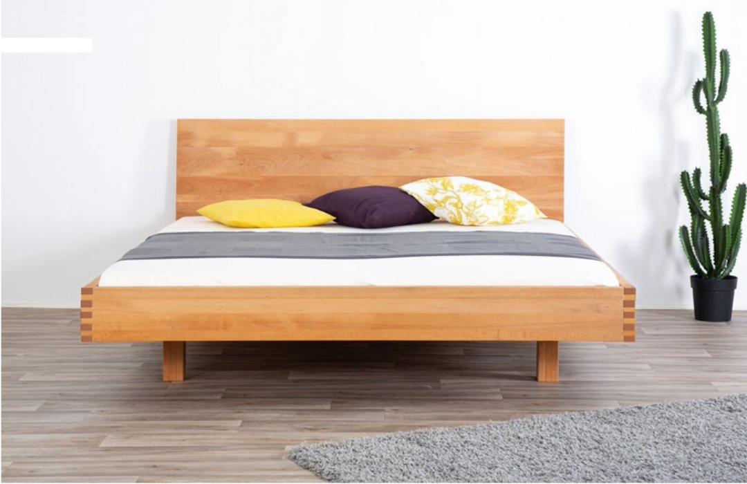 Dieses Massivholzbett mit schwebender Optik und reduziertem Design bietet viele induviduelle Aufbau und Zubehörmöglichkeiten in einem Preispaket.